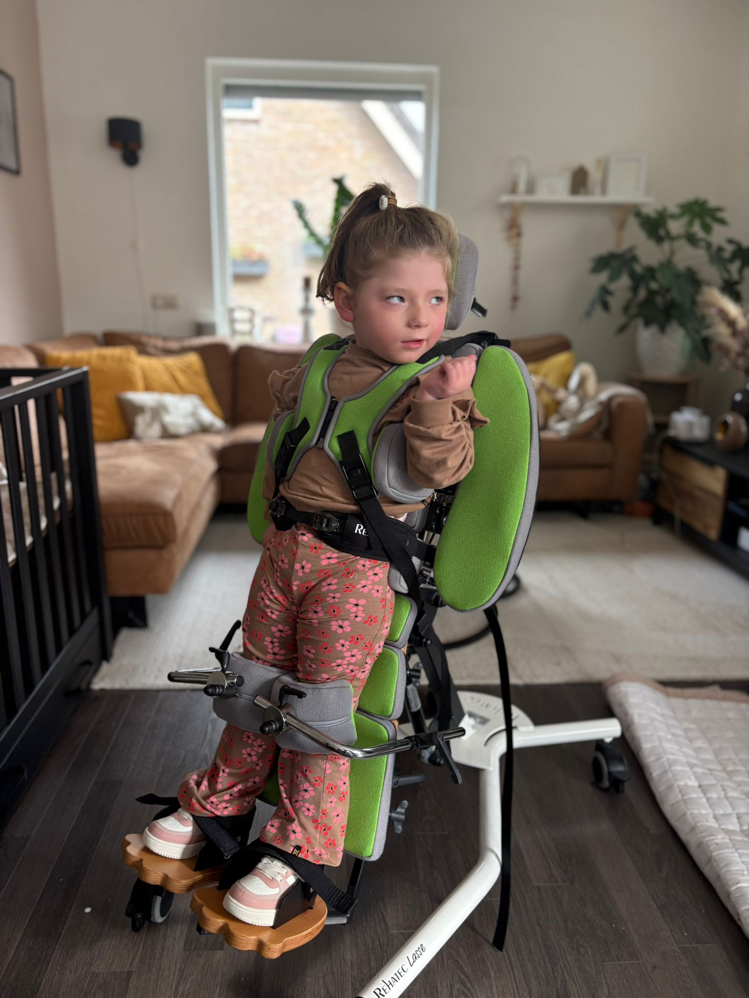 Binnenkort krijgt Esmée haar rolstoel en hier moet het huis nog op aangepast worden. Wij hopen vanuit de stichting drempelhulpen te kunnen vergoeden, zodat Esmée moeiteloos door het huis en naar de tuin kan worden verplaatst. Met een logopediste wordt er volop geoefend met picto-kaarten, zodat Esmée leert haar voorkeuren aan te geven. Ze kan zich ook al beter uitdrukken door middel van haar mimiek, oogopslag en het maken van kleine geluidjes.